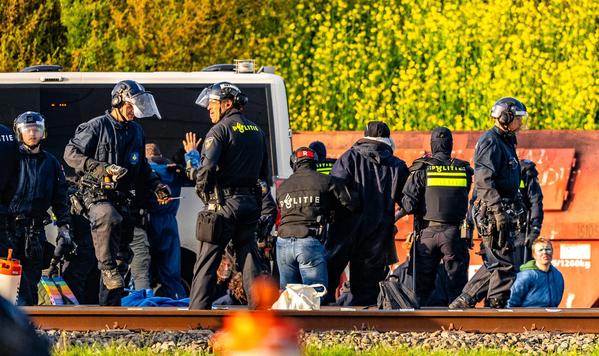 ELST - Activisten van Geef Tegengas blokkeren sinds 12.15 uur op vrijdagmiddag de Betuweroute, een goederenspoortraject dat dwars door Gelderland naar Duitsland loopt. De activisten vragen aandacht 'voor Nederlandse 'medeplichtigheid' aan oorlogsmisdaden van de VS, mensenrechtenschendingen wereldwijd en de klimaatcrisis'.