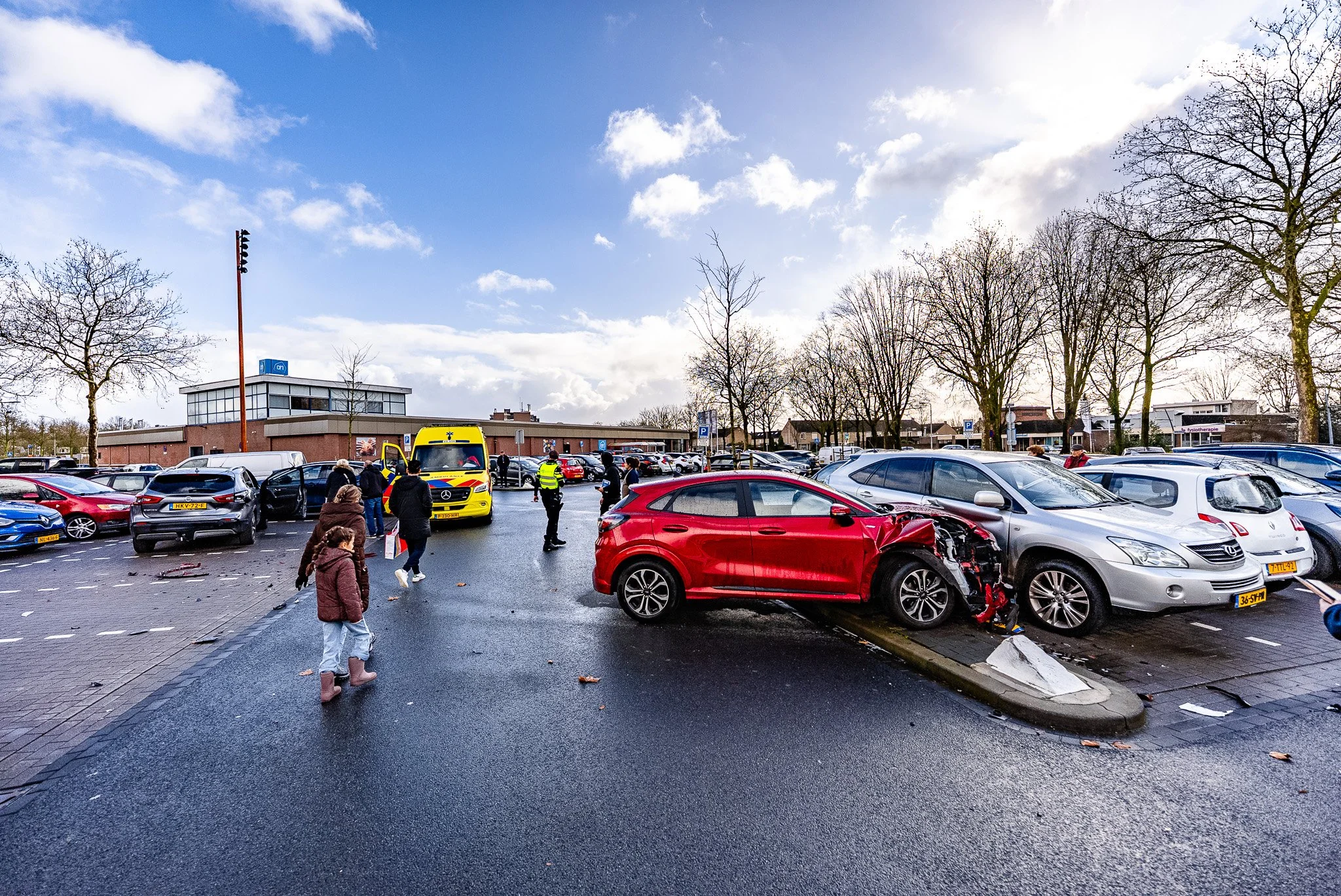 De parkeerplaats bij het winkelcentrum was na de botsingen bezaaid met brokstukken van de auto's.