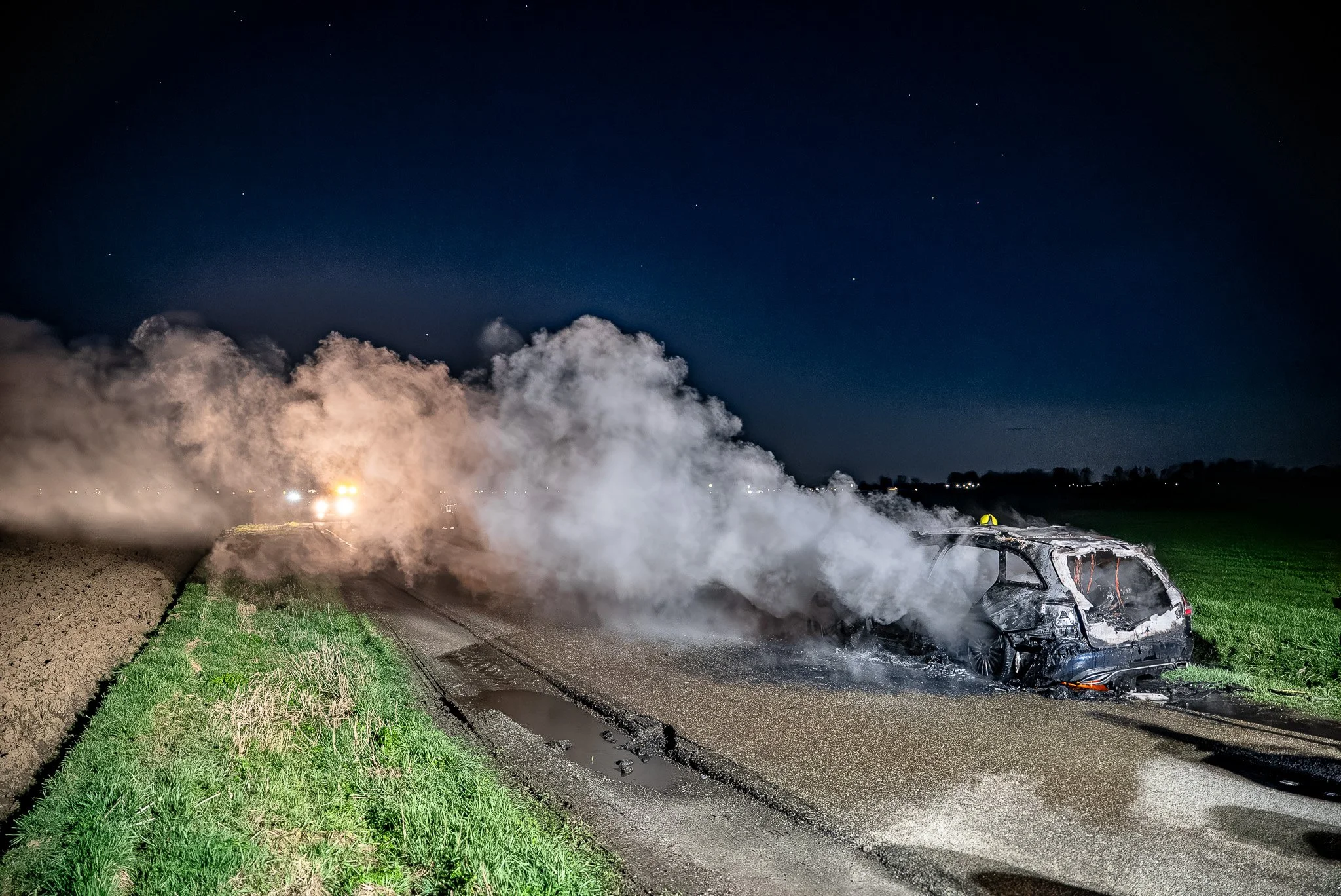 Het voertuig wordt weggetakeld door een bergingsbedrijf. Wat de oorzaak van de brand is, is nog onbekend. De weg was tijdelijk deels afgesloten.