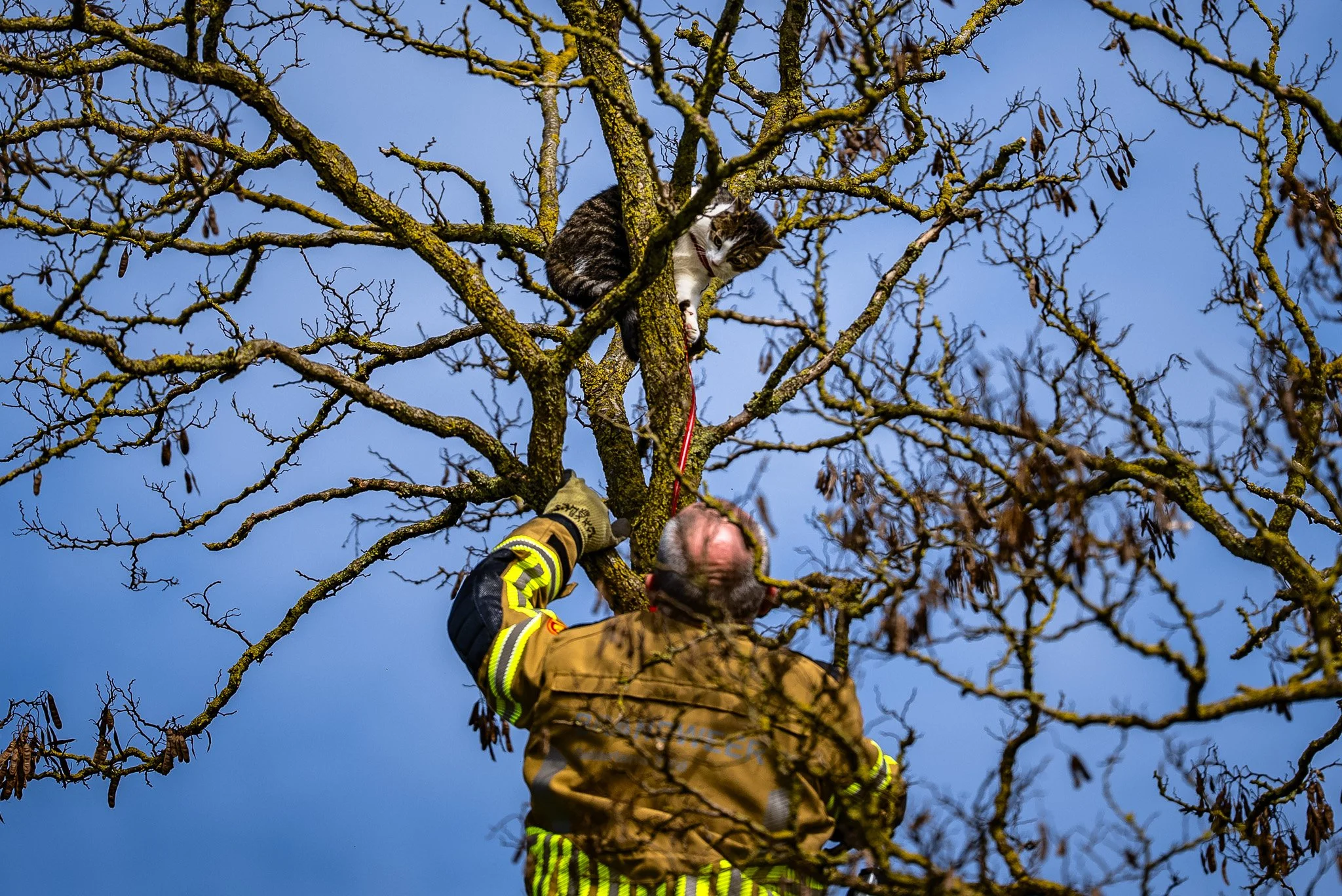 WIJCHEN - Op vrijdag 3 april rond 12:30 is de brandweer van Wijchen opgeroepen omdat er een kat vastzat in een boom aan de 16e straat in Homberg. De kat hing enkele meters hoog in een tuigje en kon zichzelf niet bevrijden. De brandweer heeft met een ladder het dier kunnen redden. Ze hebben de kat meegenomen en teruggebracht naar de eigenaar. Een brandweerman zei duidelijk tegen de kat dat hij niet meer in de boom moest klimmen.