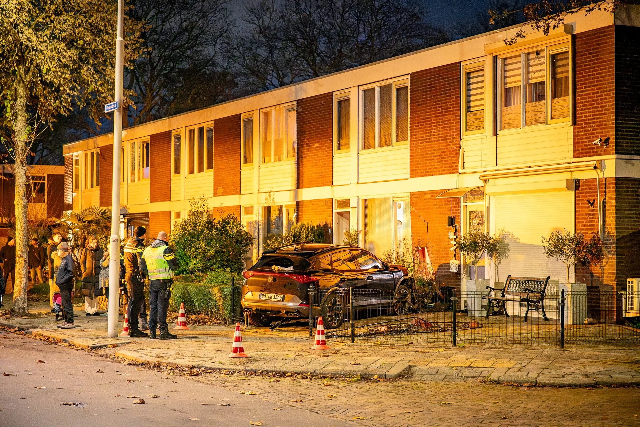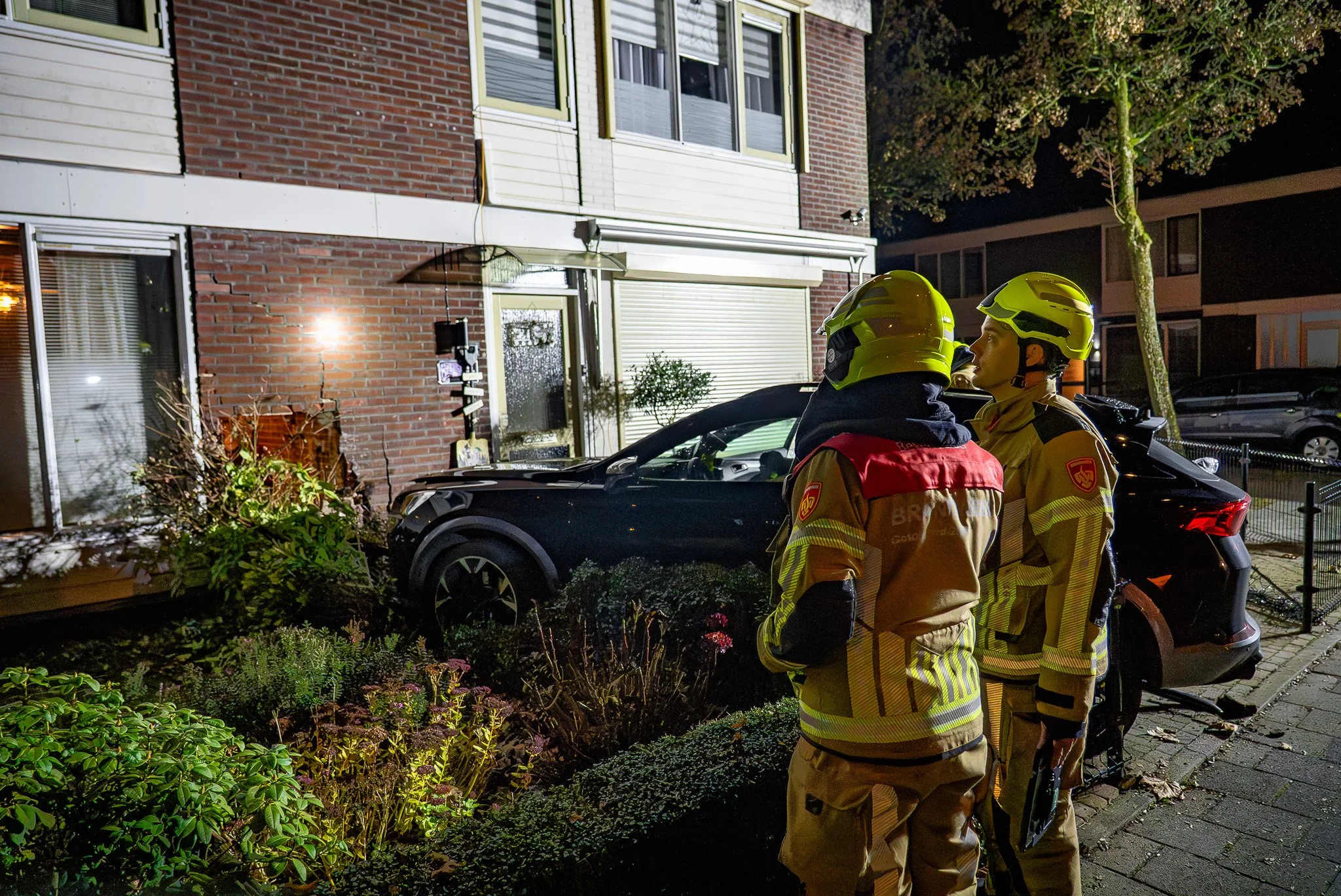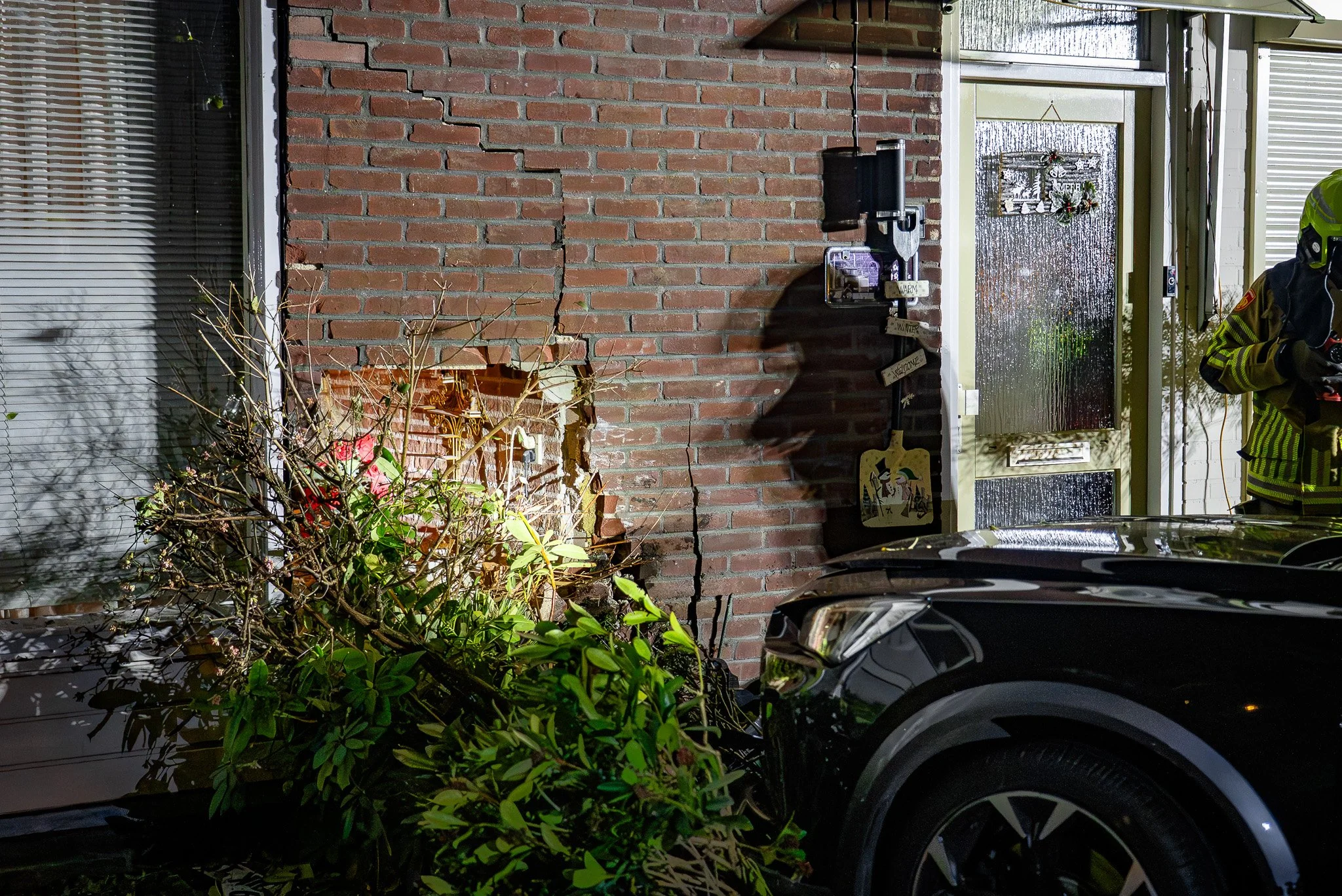 Politie en brandweer waren snel ter plaatse, meldt een 112-verslaggever. De brandweer controleerde of er sprake was van instortingsgevaar en onderzocht de auto, een hybride of volledig elektrisch model, op veiligheidsrisico’s. Nadat de situatie stabiel werd verklaard, haalde een bergingsbedrijf het voertuig weg.