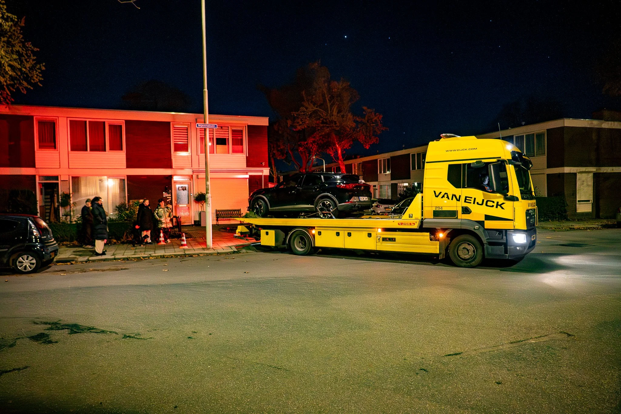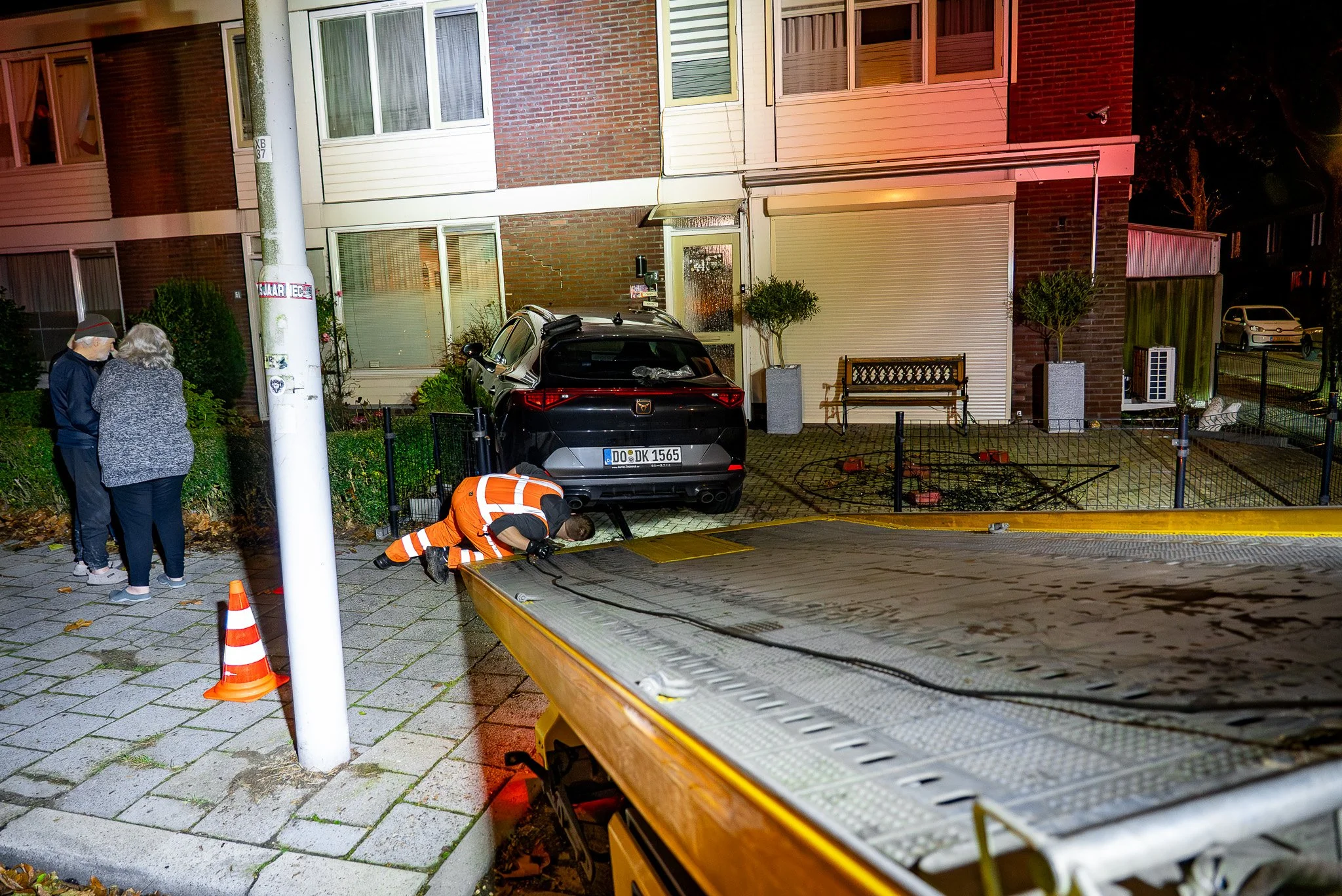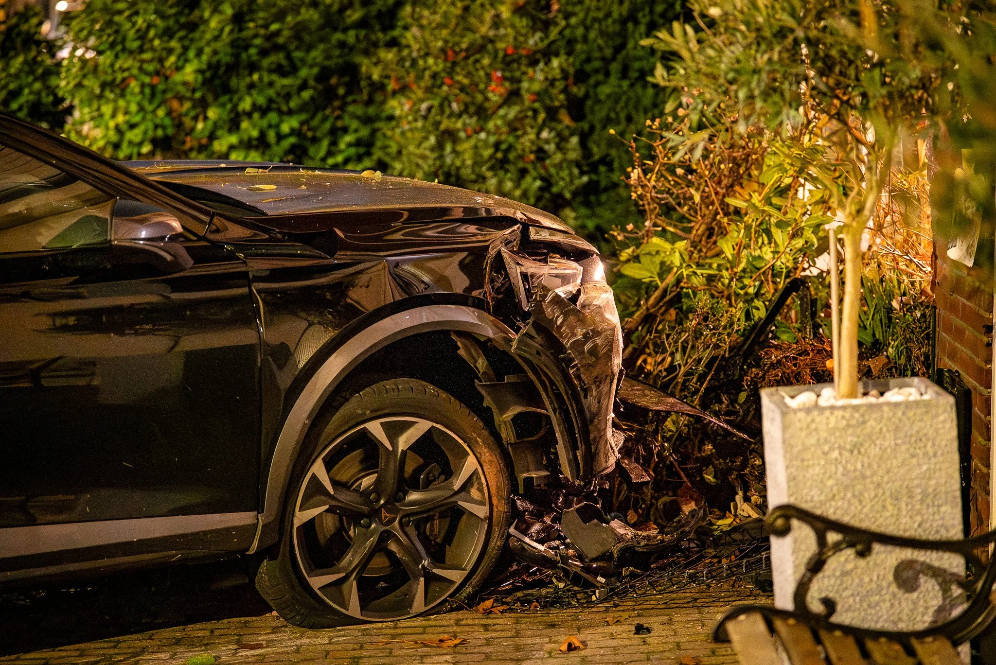 Politie en brandweer waren snel ter plaatse, meldt een 112-verslaggever. De brandweer controleerde of er sprake was van instortingsgevaar en onderzocht de auto, een hybride of volledig elektrisch model, op veiligheidsrisico’s. Nadat de situatie stabiel werd verklaard, haalde een bergingsbedrijf het voertuig weg.