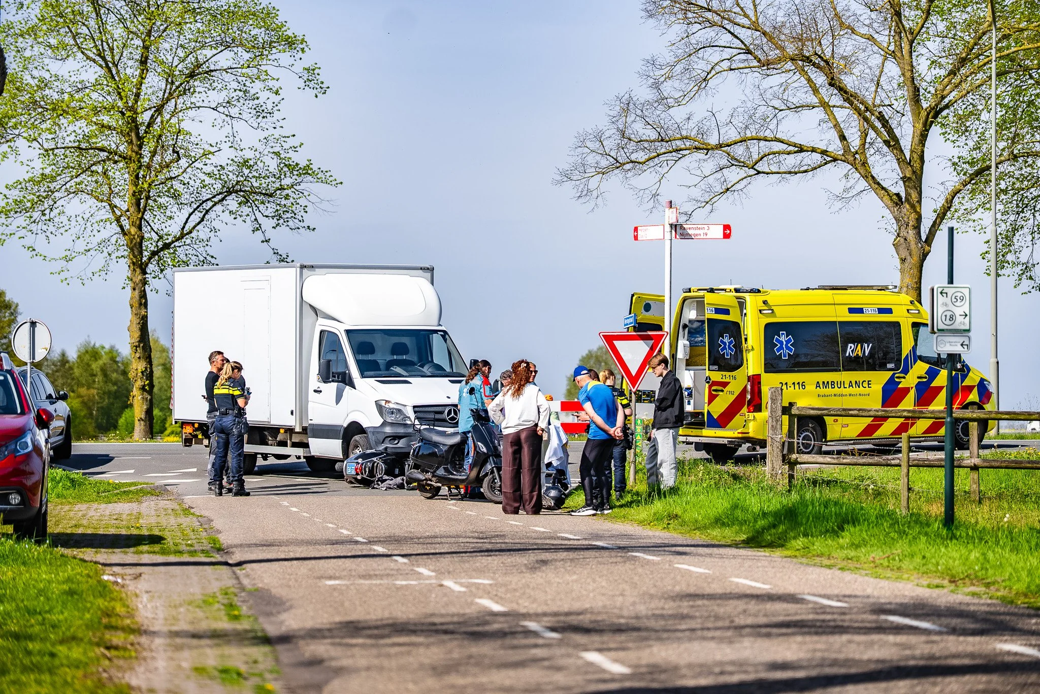 HERPEN - Op vrijdag 17 april heeft er een botsing plaatsgevonden op de kruising van de Hertogstraat en de St. Sebastianusstraat in Herpen. De hulpdiensten werden om 11:25 uur geallermeerd voor het ongeluk. Ambulance en politie kwamen snel ter plaatse. De bestuurster van de scooter werd al geholpen door omstanders voordat de hulpdiensten arriveerden. Zij is door het ambulancepersoneel nagekeken en met onbekende verwondingen naar het ziekenhuis gebracht. De chauffeur van de bakwagen, die minimale schade had, bood aan om de scooter mee te nemen. en af te zetten na de gewenste plek. Er zijn geen andere gewonden gevallen, de weg was tijdelijk dicht voor auto's hoewel een aantal een andere weg via de berm hadden gevonden.