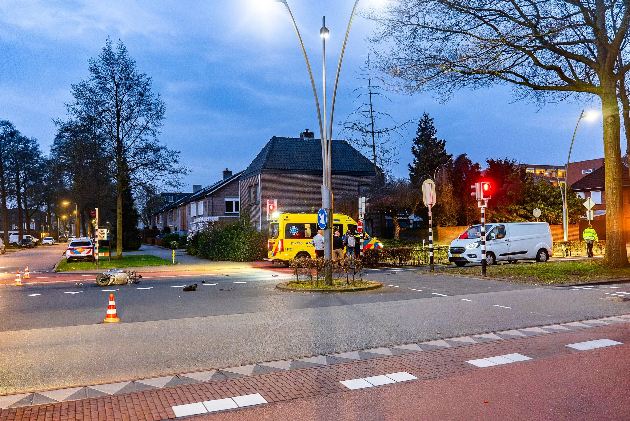 Bij het ongeval kwam de scooterrijder ten val en belandde met zijn scooter enkele meters vóór de bestelbus. Hulpdiensten, waaronder twee politie-eenheden en een ambulance, kwamen ter plaatse. Het ambulancepersoneel heeft de scooterrijder gecontroleerd, waarna hij met onbekend letsel is overgebracht naar het ziekenhuis.