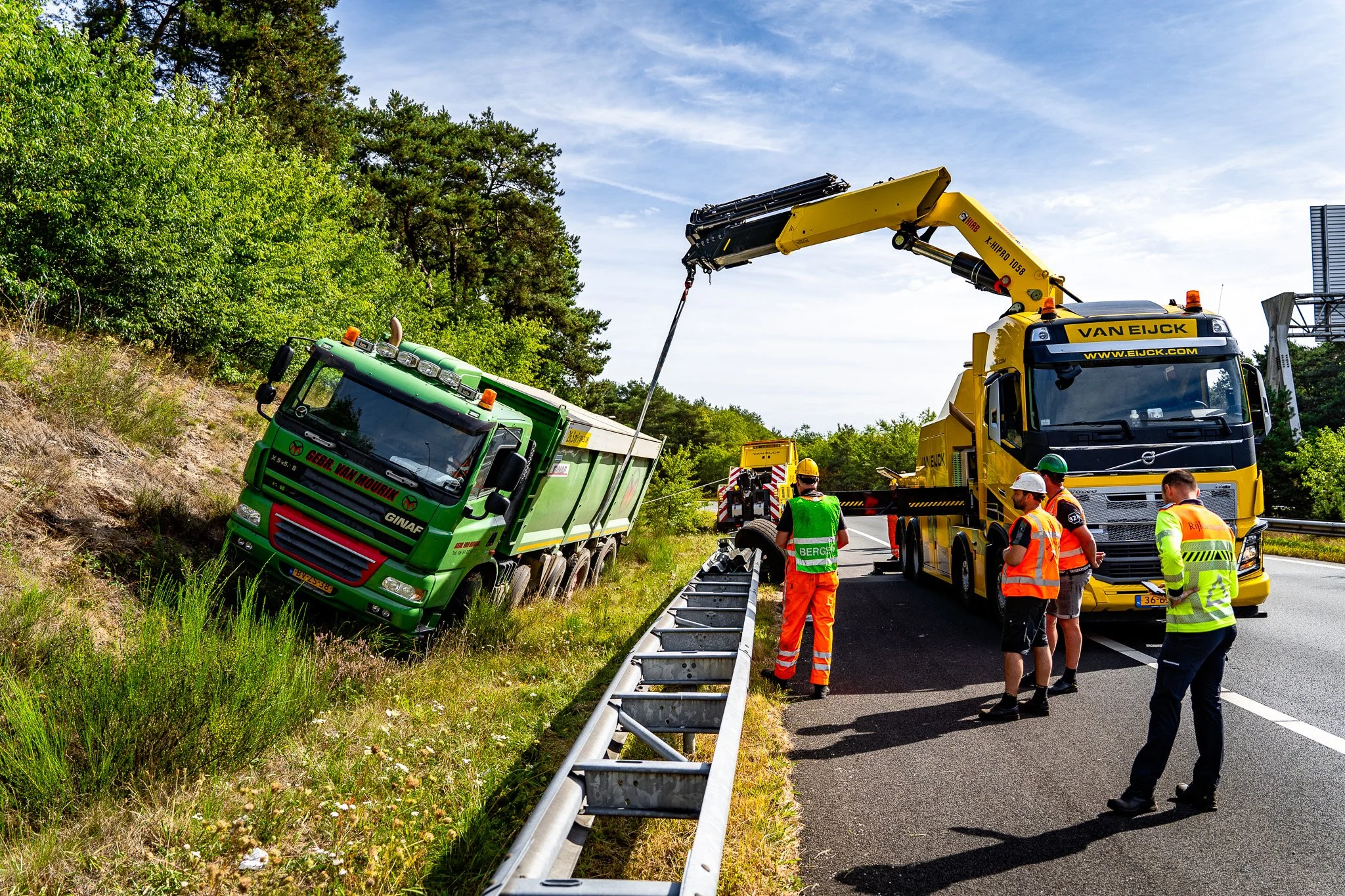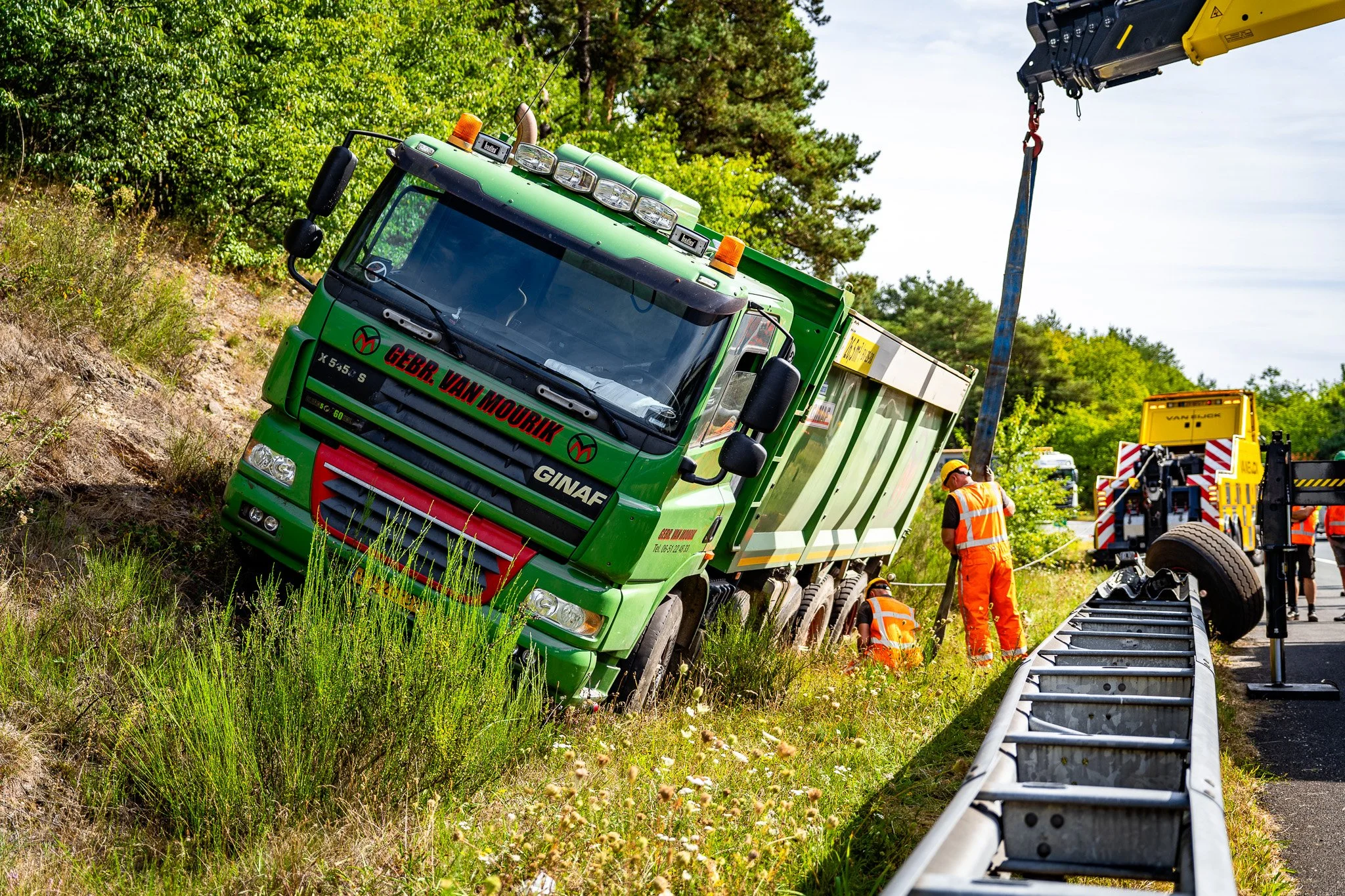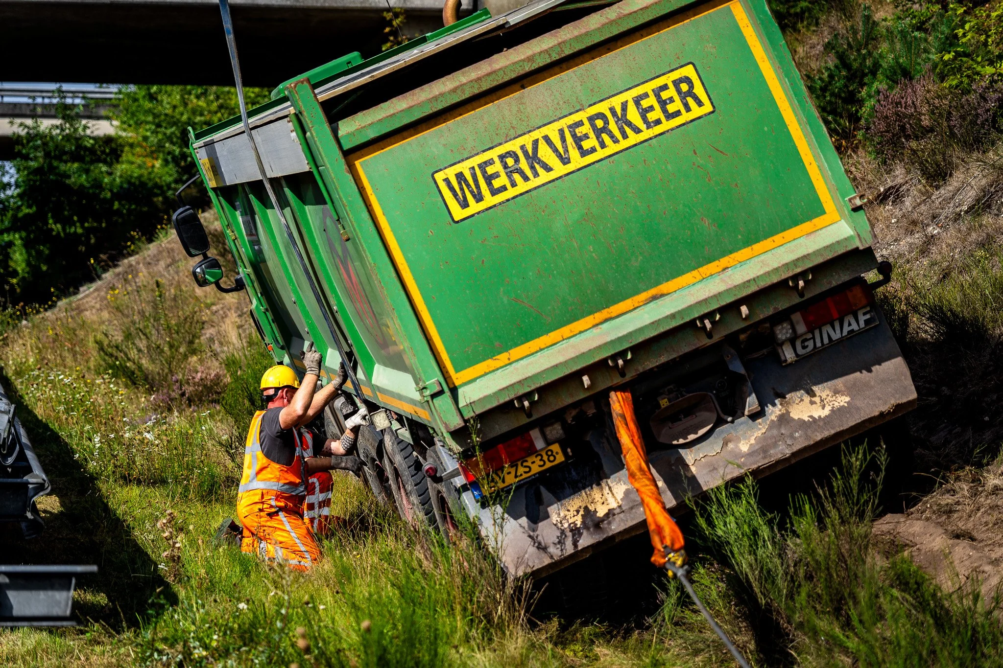 WOLFHEZE – Bij knooppunt Grijsoord is in de nacht van dinsdag op woensdag een vrachtwagen in de berm beland. De kiepwagen raakte door een nog onbekende oorzaak van de weg en kwam na een stuk vangrail te hebben geraakt tot stilstand in de berm.